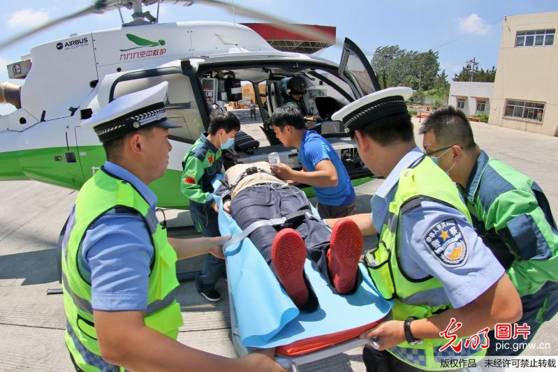 2018年7月19日,山东烟台多部门联合举行高速公路直升机医疗救援演练。
